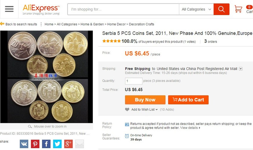 Ukoliko želite da posedujete komplet srpskih kovanica od 20, 10, pet, dva i jednog dinara iz 2011. godine, možete da ih kupite na sajtu Aliekspres za 6,45 dolara, odnosno za 716 dinara.