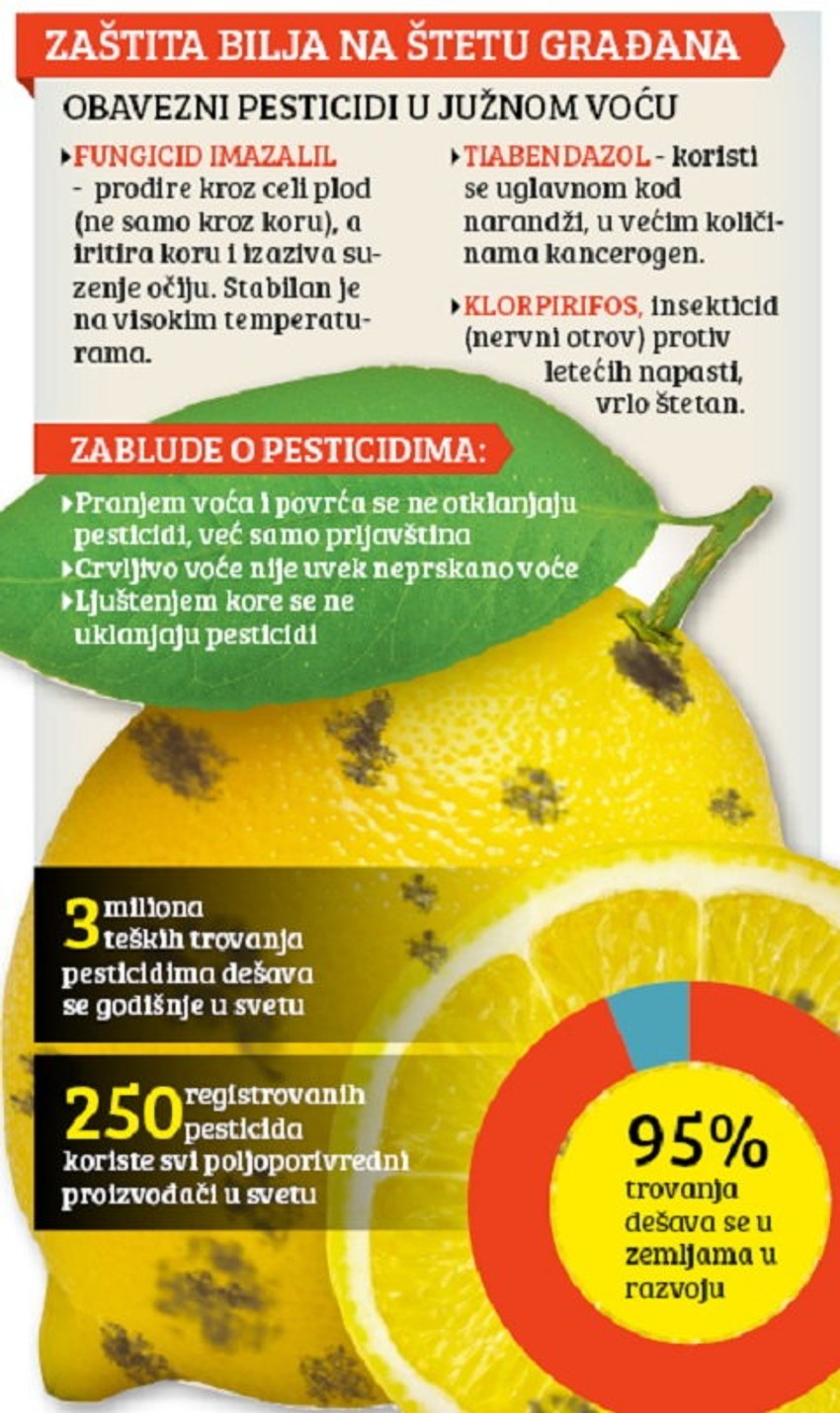 Iako su nadležne inspekcije u prethodnoj godini otkrile samo dva slučaja prekomernog korišćenja pesticida u voću, stručnjaci poručuju da treba biti oprezan u konzumiranju južnog voća jer je po pravilu potapano u pesticide koji omogućavaju da ovi plodovi budu dugotrajni.