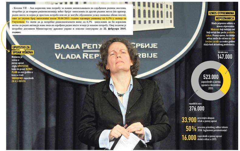 U decembru 2013, mesecu koji se uzima kao reper u javnoj upravi na svim nivoima, bilo je zaposleno 523.000 ljudi. Ideja je, recimo, da Ministarstvo prosvete odlučuje o otkazima u školama po Srbiji, a Ministarstvo zdravlja o višku u zdravstvenim ustanovama. Svim institucijama u državi poslata su nedavno uputstva kako da pripreme plan poslovanja, ali kasnije i pravilnik o sistematizaciji radnih mesta. I svima je poslat zahtev za isto smanjenje broja zaposlenih - 6,5 odsto.