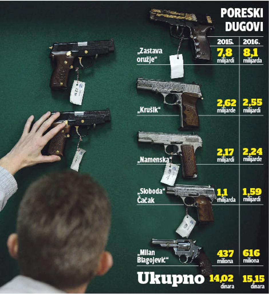 Tako se u državi Srbiji nastavlja sa paradoksima da umesto kazne, odnosno tužbe ili plenidbe imovine, srpski oružari dobijaju nagradu, odnosno država im konovertuje dug i postaje njihov suvlasnik. Koliki će ona udeo imati u kapitalu - ne zna se, ali zna se da je dug "Zastave oružja" 8.138.095.654 dinara, "Krušika" 2.550.738.867, "Namenske" 2.249.281.504, "Slobode" 1.598.490.987 i "Milana Blagojevića" 616.968.466.