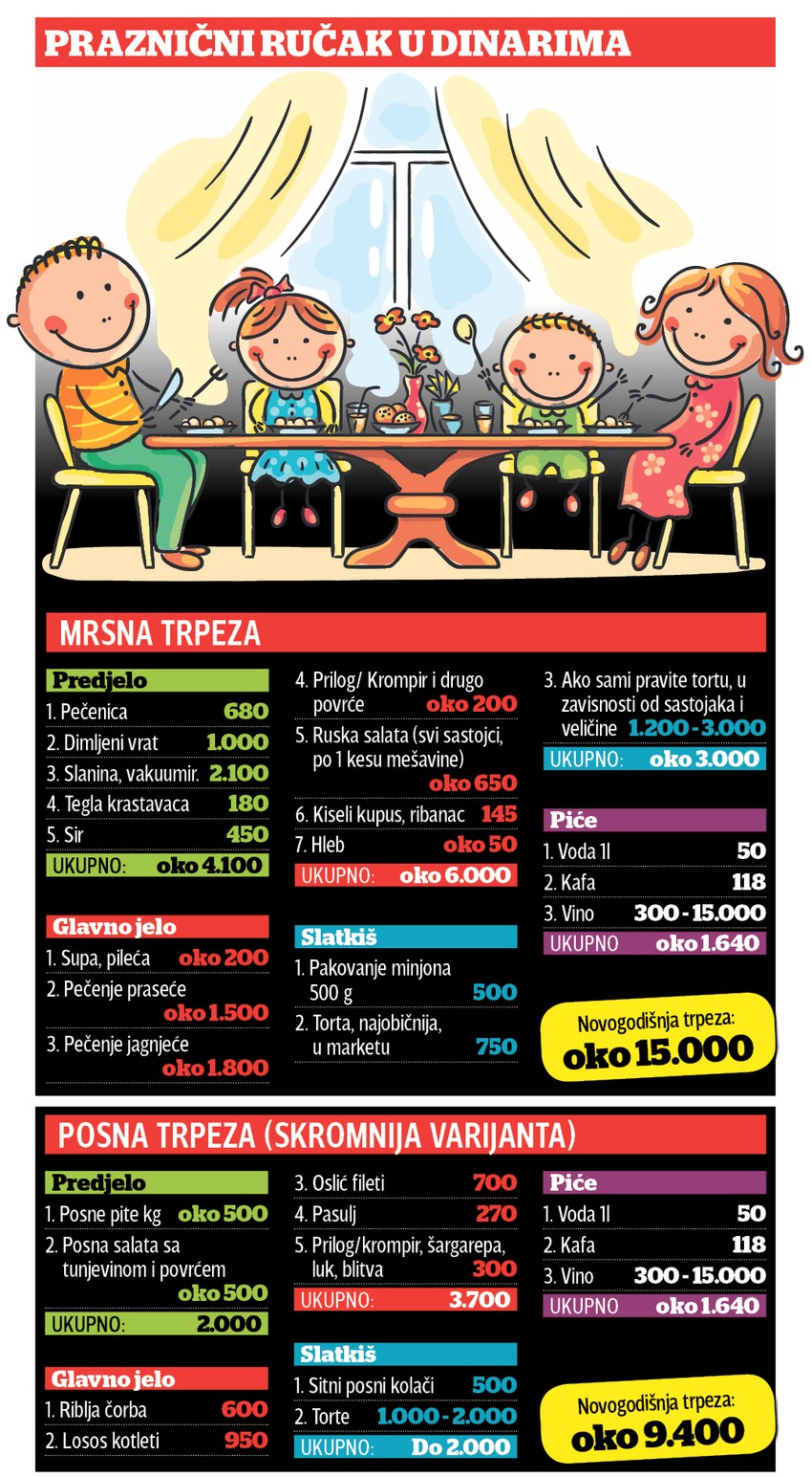 Kad se tome doda da je prosečna plata u novembru bila 44.166 dinara, to znači da praktično trećina novca ode za trpezu za dva dana. Kako nas u januaru čeka i pripremanje trpeze za Božić, a uz već postojeću stavku komunalija i ostalih stalnih troškova, pravo je pitanje kako preživeti ceo mesec s ostatkom novca.