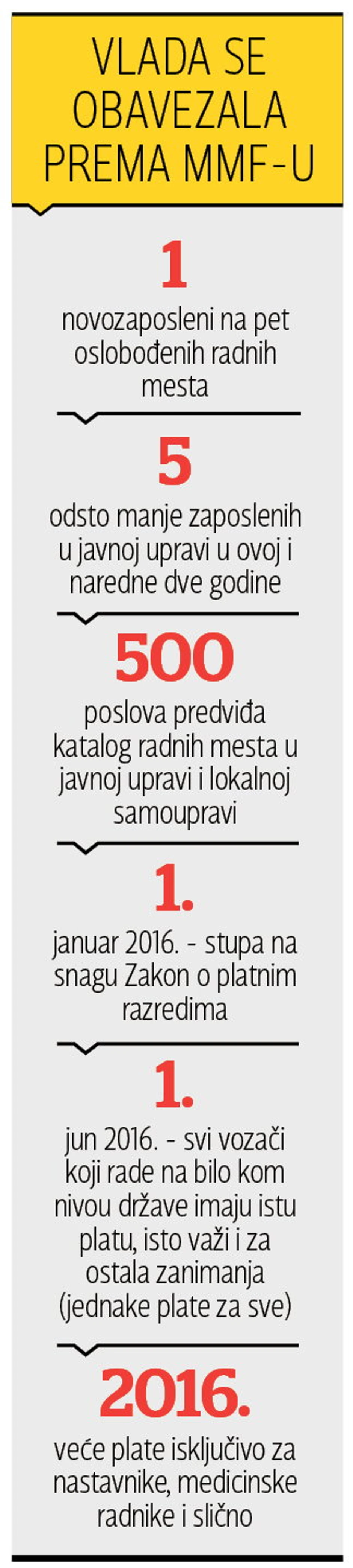 - Baza svih zarada biće unificirana. Do kraja aprila naredne godine usvojićemo posebne zakone o zaradama i drugu regulativu, tako da će unifikacija platnih razreda za uporedive poslove i usaglašene osnove zarada početi da važi od juna 2016. Bilo koji predlog za povećanje zarada u narednoj godini biće ciljan na sektore sa najvećim raskorakom u zaradama, kao što je slučaj medicinskog osoblja u zdravstvu i učiteljskog u sektoru obrazovanja - kaže se u pismu koje je Vlada uputila direktorki MMF.