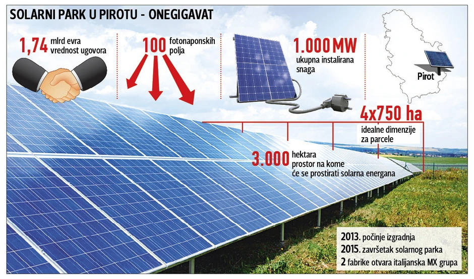 Ovaj dokument nema obavezujući karakter jer je ostalo da se preciziraju bitne stvari kao što je priključenje na visokonaponske električne vodove od parka do prenosne elektromreže - kaže Đurić i dodaje da investitor nije tražio da mu država plati podsticajne tarife za proizvodnju. To je zato što će sva energija koja se proizvede u ovom parku kapaciteta 1.000 megavata biti namenjena izvozu, mahom u EU. Đurić kaže da je zasad nekoliko opština u Pirotskom okrugu u opticaju za izgradnju solarne energane.