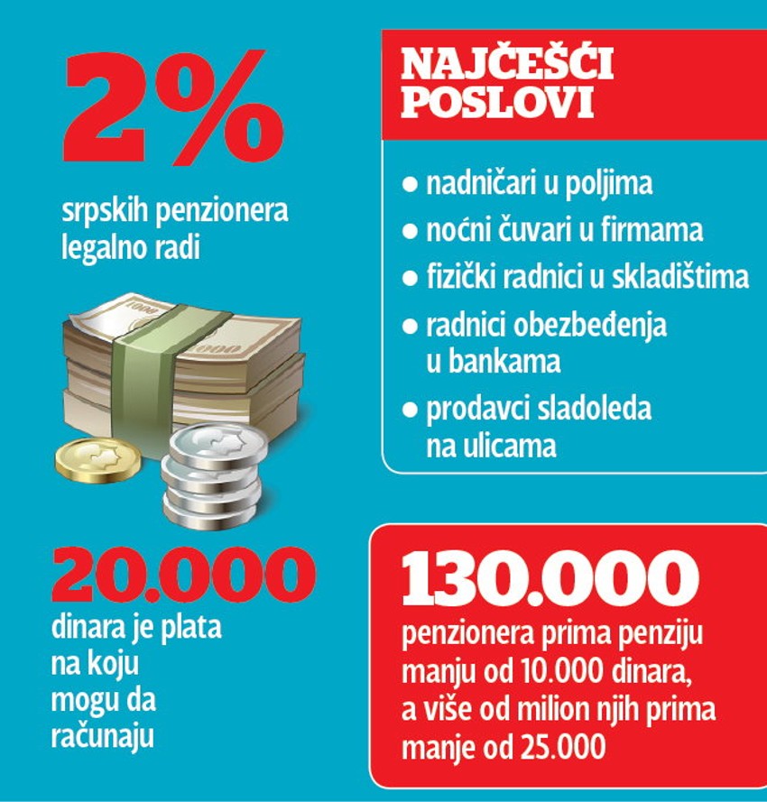 To je samo jedan u moru oglasa koje postavljaju srpski penzioneri kojima je penzija dovoljna jedva za puko preživljavanje. Oni zato sve češće rade kao nadničari u poljima, noćni čuvari u firmama, fizički radnici u skladištima, prodavci sladoleda na ulicama ili radnici obezbeđenja u bankama.