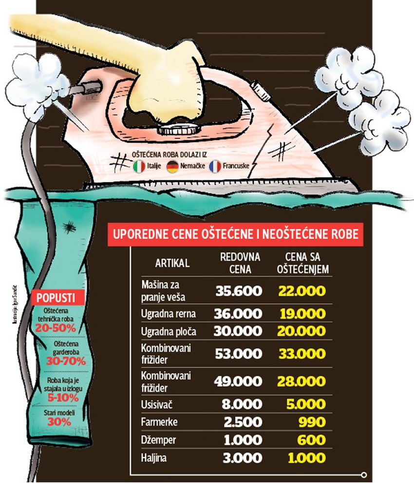 Mnoge prodavnice cenu smanjuju oko 10 odsto i za robu koja je stajala u izlogu. Oštećena garderoba najčešće može da se nađe u sekend hend prodavnicama, ali se dešava da i u regularnim prodavnicama izdvoje odeću sa greškom. Ipak, u buticima je češća situacija da trgovci pokušavaju da podvale pod velom sniženja pocepane haljine ili farmerke bez nitni. Osim prodavnica koje prodaju robu koja je slučajno oštećena, postoje i one koje se bave isključivo prodajom oštećenih aparata, a uvoze robu iz Nemačke, Italije i Francuske.