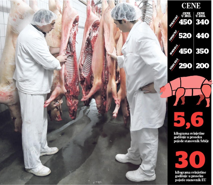 Sada je, zbog neisplativosti, obustavljen gotovo celokupan izvoz, pa je zbog velike ponude u Srbiji i cena svinjskog mesa u maloprodaji počela da pada. Svinjski vrat tako je jeftiniji za 110 dinara nego pre nekoliko meseci, dok je cena kilograma buta niža za 80 dinara. Samo tokom prethodnih mesec dana cena ovog mesa je pala za oko 30 dinara.
