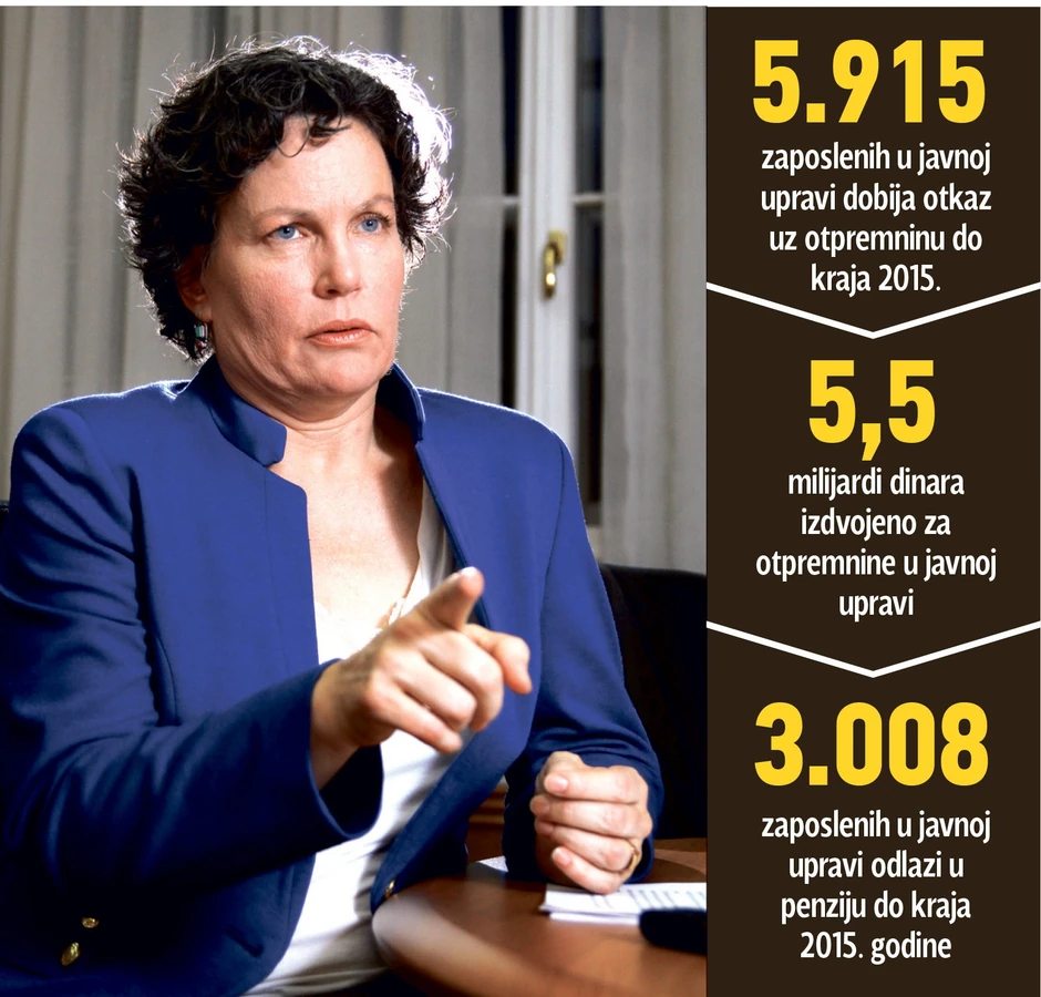 - Još nije donet program za rešavanje viška zaposlenih u javnoj upravi za ovu godinu, ali je izdvojenih 5,5 milijardi dinara za otpremnine viškova i zaposlenih koji odlaze u penziju u 2015. izračunat na bazi procene da će svaki zaposleni dobiti dinarsku protivrednost 200 evra po godini staža - kažu za “Blic” u Vladi Srbije.