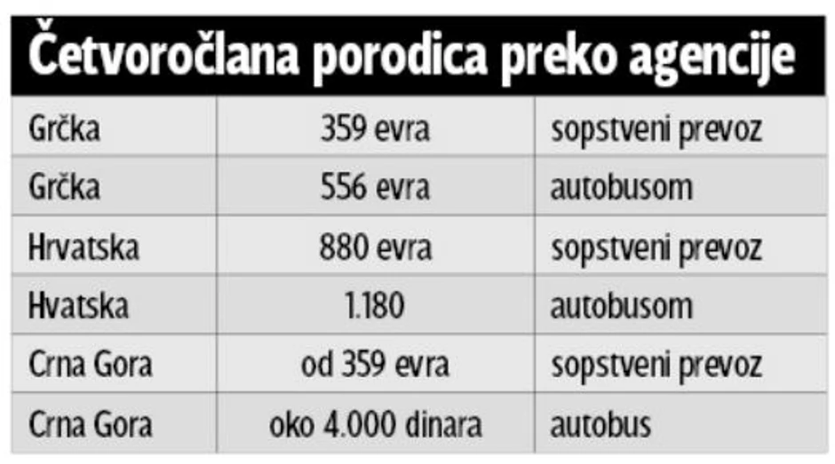 Turističke agencije za Crnu Goru imaju u ponudi za četvoročlanu porodicu 10 noćenja od 300 evra. Recimo, apartman u Prčnju na 10 dana u sezoni je 465, u Bigovu 685 evra. Postoje ponude i od 285 evra krajem juna. Razlika u ceni za smeštaj u hotelu nije velika i turistički radnici preporučuju da porodica uplati hotel sa ishranom u Crnoj Gori.