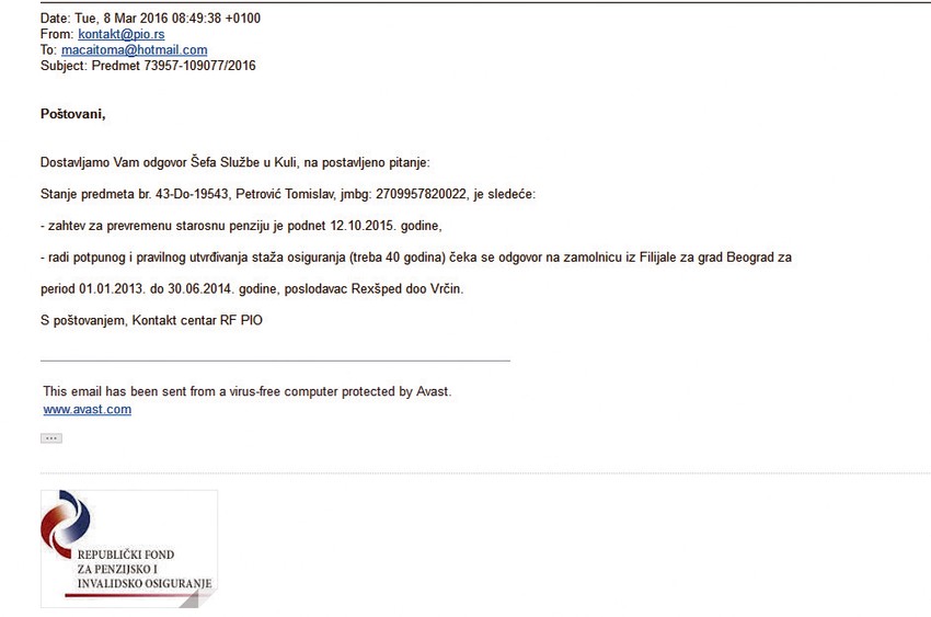 Iako se na osnovu prepiske koju je Petrović imao s kontaktom u PIO fondu jasno vidi da njegov predmet niko nije pipnuo, u ovoj instituciji kažu da je krivac nepotpuna dokumentacija.