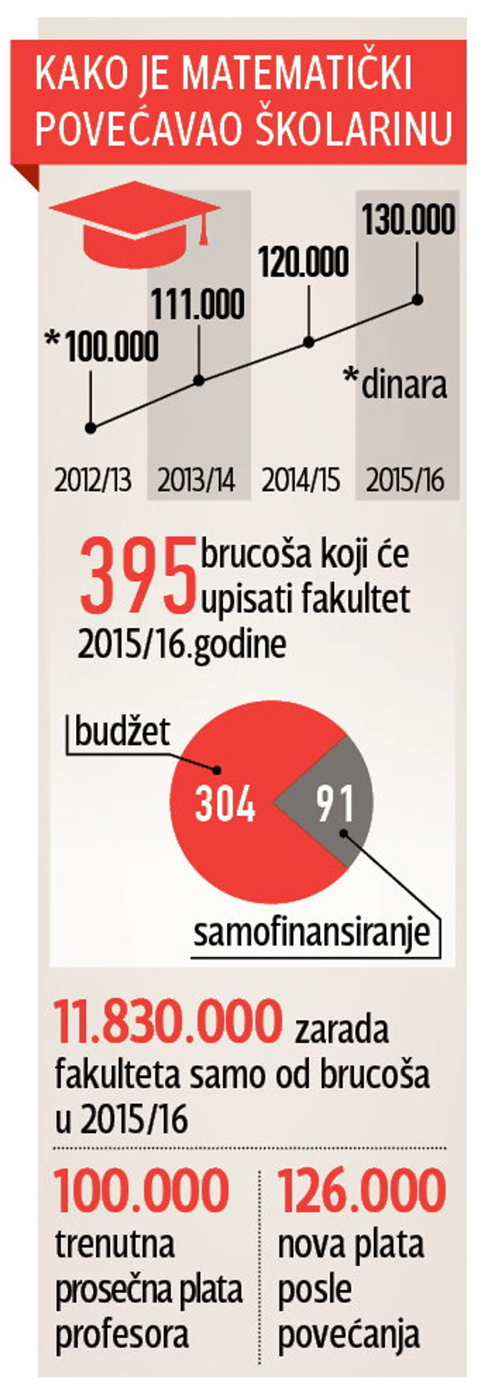 Matematički fakultet je za iduću godinu najavio povećanje cene školarina sa 120.000 na 130.000 dinara, iako je prošle godine školarina na ovom fakultetu već poskupela sa 111.000 na 120.000.