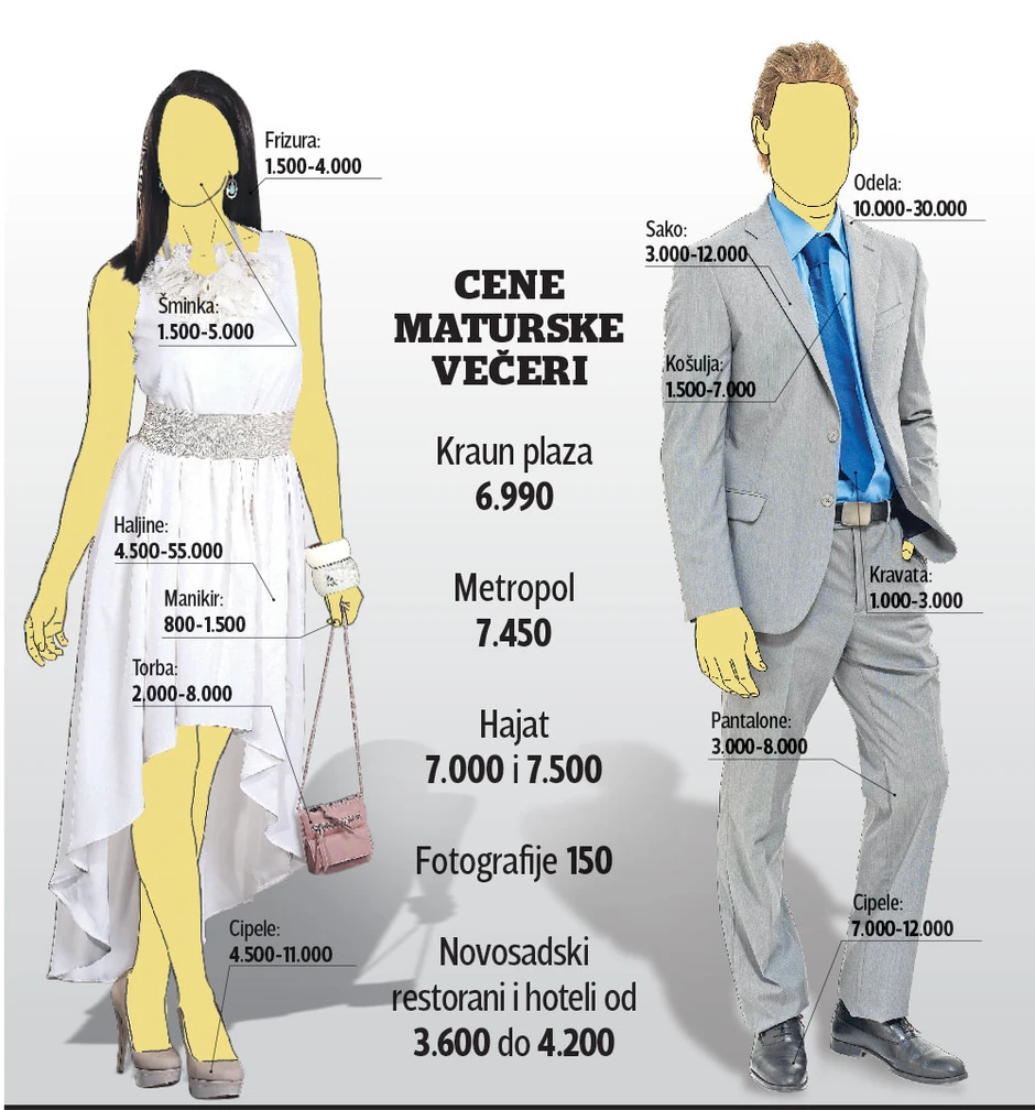 Školama su stigle ponude sa cenama i sadržajima za proslavu maturske večeri, a konačnu odluku donose saveti roditelja. Luksuzni hoteli su organizovanje proslava prepustili agencijama koje se utrkuju koja će da angažuje poznatiji bend i popularnijeg voditelja i ponuditi bolje nagrade. I dok van Beograda proslave koštaju oko 3.500, u prestoničkim hotelima cene idu i do 7.500 dinara.