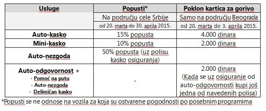 Popusti za pravna i fizička lica važe na teritoriji cele Srbije, od 20. marta do 30. aprila 2015, na svim prodajnim mestima „Dunav osiguranja” i posredstvom ostalih kanala prodaje.