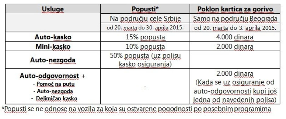 U saradnji sa „Lukojl Srbija”, Kompanija daruje i poklon karticu za gorivo u vrednosti od 2.000 ili 4.000 dinara. Ponuda važi na teritoriji Beograda za fizička lica u periodu od 20. marta do 3. aprila 2015.