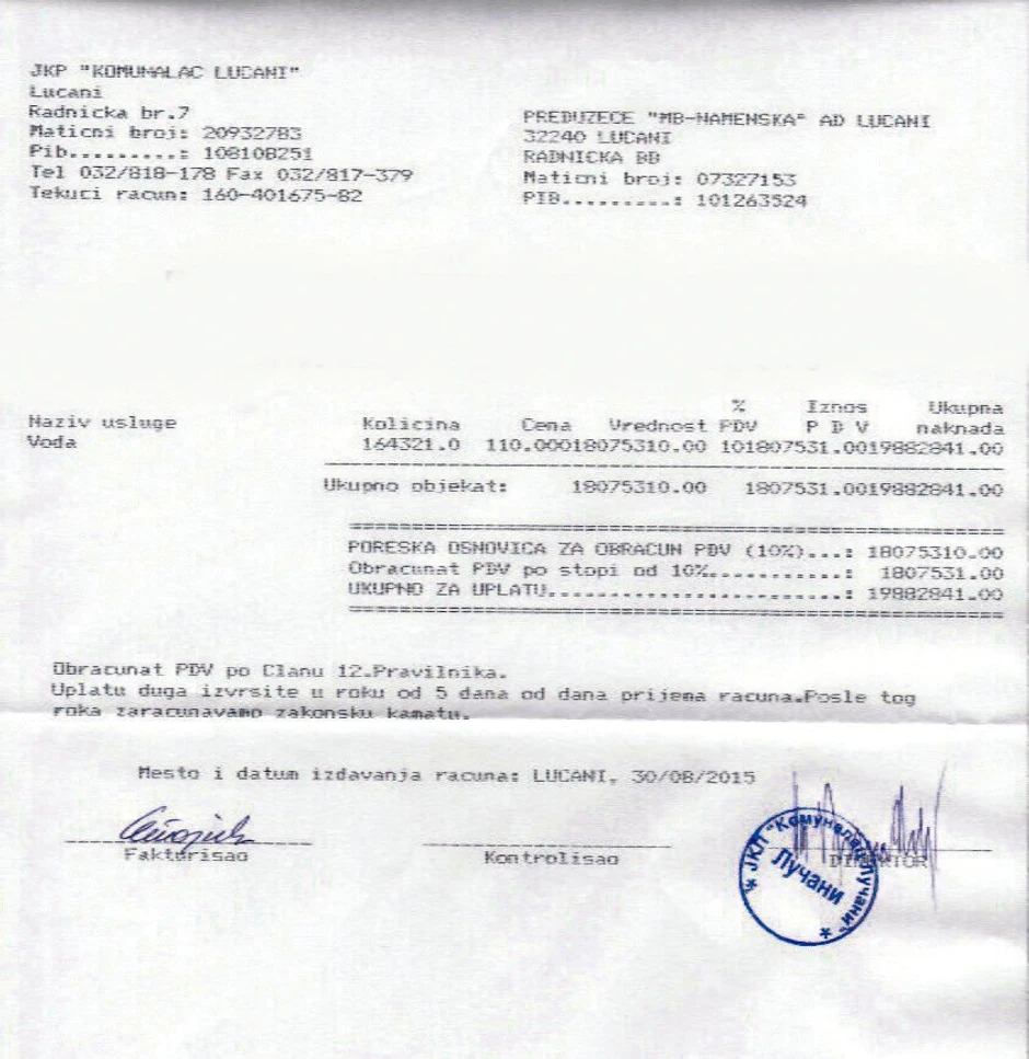 U fabriku MB „Namenska“ u Lučanima stigao je račun za vodu koji iznosi neverovatnih 19,9 miliona dinara, što je šokiralo odgovorne u tom preduzeću.