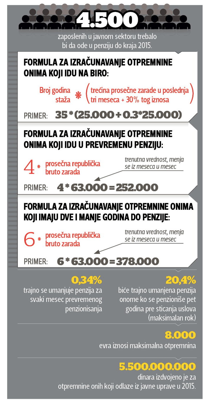 Inače, Vlada je na sednici u četvrtak konstatovala da sve veći broj zaposlenih pokazuje interesovanje za odlazak u penziju. Najveći broj njih je u prosveti, a zatim i u zdravstvu. - Zaključeno je da treba podržati svakog ko ima mogućnost da ode u penziju ako se trenutno nalazi na radnom mestu koje će biti ugašeno. Oni koji rade na mestima koja neće biti ugašena, koja su važna za taj sistem neće dobiti podršku da odu u penziju, uz otpremninu - otkriva izvor „Blica“ iz Nemanjine.