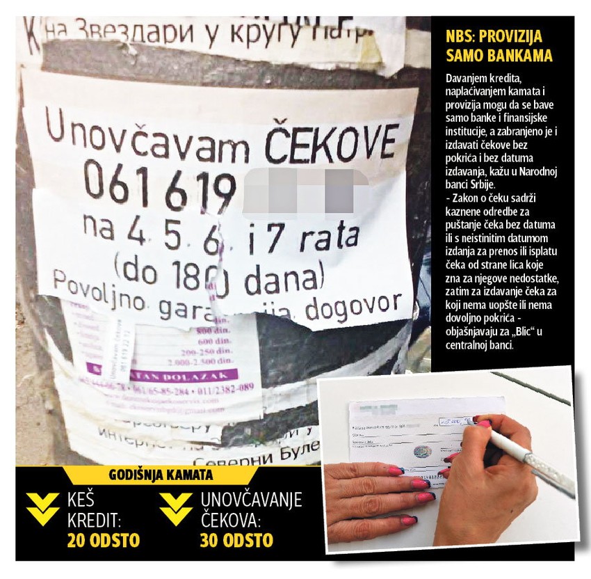 - Ne samo što je to apsolutno nelegalno, nego građani mogu lako da budu prevareni. Niko osim banaka ne sme da daje pozajmice i uzima kamate. Osim toga, postoje oni koji uzimaju blanko ček, pa obećaju da će da stave datum naknadno, kada vlasniku čeka bude odgovaralo, ali onda već sledećeg dana puste ček i naprave ljudima još veći problem - kažu nam u jednoj banci.