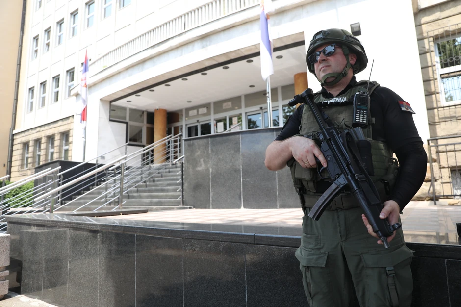 Okrivljene su dovezle četiri marice pod rotacijama, u pratnji četiri policijska džipa. Ispred zgrade se nalaze pripadnici Žandarmerije naoružani dugim cevima.