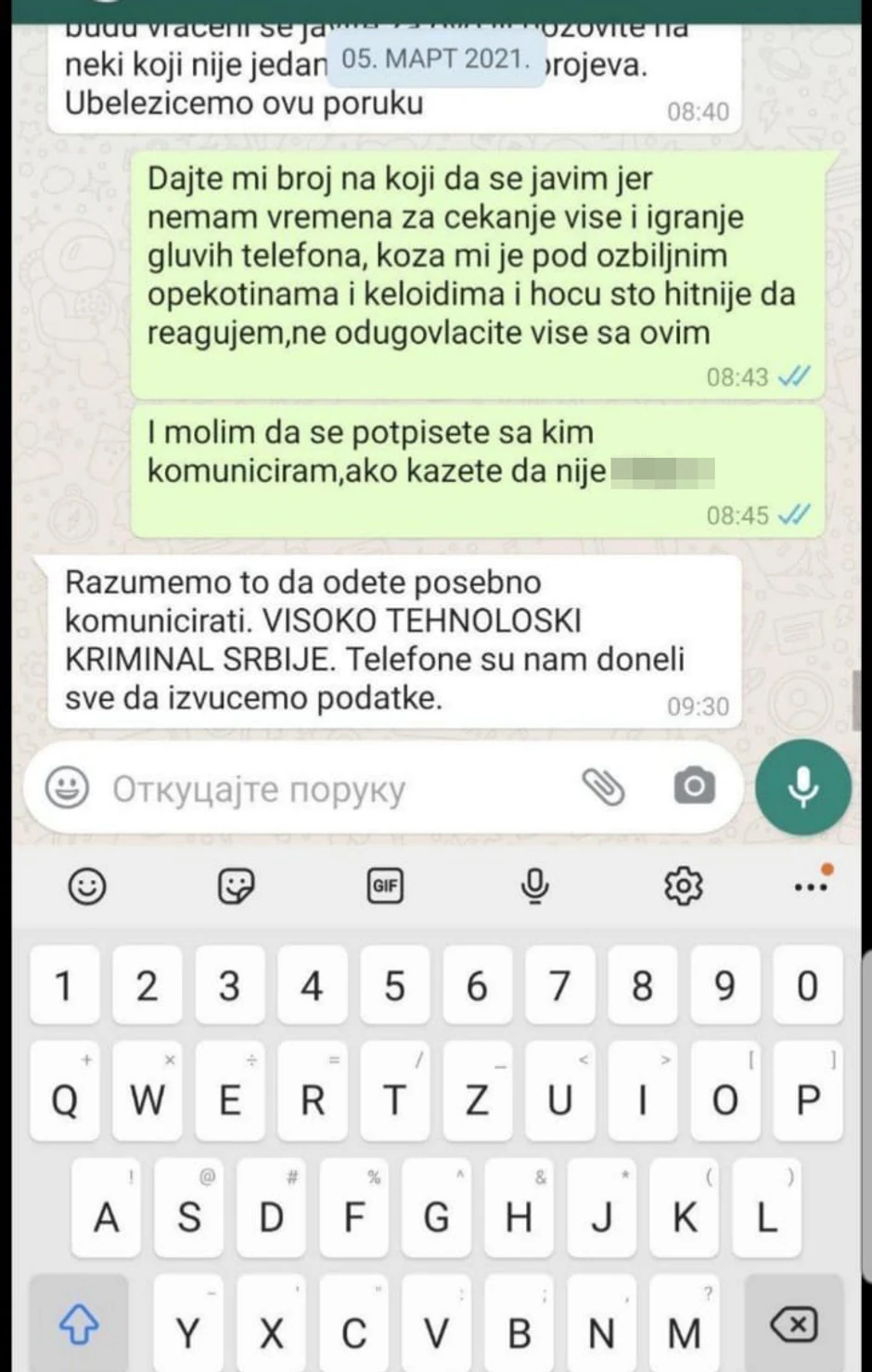 Anja nije želela da odustane, rekla je da nema vremena za gubljenje i da ne želi da se igra gluvih telefona, pa da joj zato daju broj na koji može da se javi i dodala je da joj je koža pod ozbiljnim opekotinama i keloidima i da zbog toga hoće što hitnije da reaguje, pa da prekinu sa odugovlačenjem.