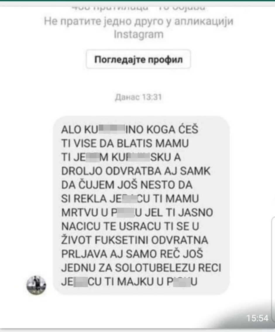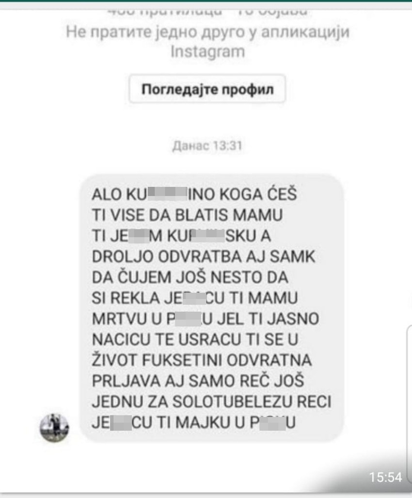 - Alo, ku*vetino, koga ćeš ti više da blatiš, mamu ti j*bem k*rvinsku, a droljo odvratna? Aj samo da čujem da si još nešto rekla, j*baću ti mamu mrtvu u p*čku, je l ti jasno? Naći ću te, us*aću ti se u život, fuksetino odvratna, prljava - pisalo je u poruci koja joj je stigla na instragramu.