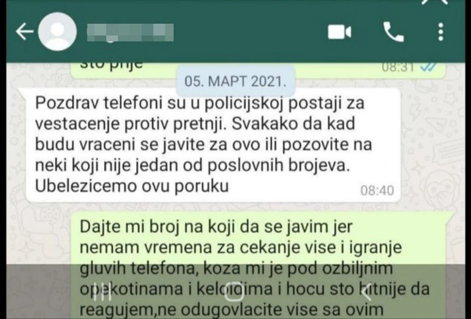 - Pozdrav, telefoni su u policijskoj postaji za veštačenje protiv pretnji. Svakako da kad budu vraćeni se javite za ovo ili pozovite na neki koji nije jedan od poslovnih brojeva. Ubeležićemo ovu poruku - pisalo je u odgovoru.