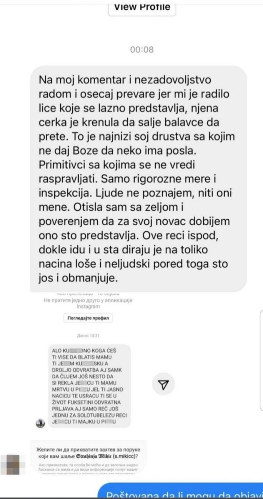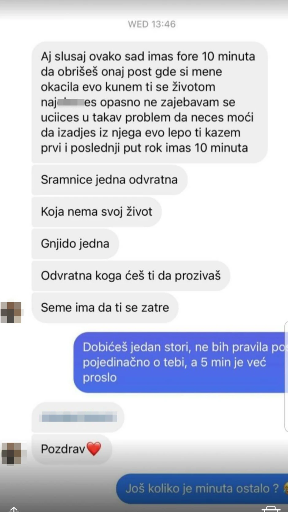 - Aj slušaj ovako, sad imaš fore 10 minuta da obrišeš onaj post gde si mene okačila. Evo, kunem ti se životom, n*jebaćeš opasno, ne z*jebavam se. Ući ćeš u takav problem da nećeš moći da izađeš iz njega, evo, lepo ti kažem prvi i poslednji put, rok imaš 10 minuta - pisalo je u prvoj poruci, a onda su se u drugim nizale uvrede i pretnje "sramnice jedna odvratna, gnjido, seme ima da ti se zatre".