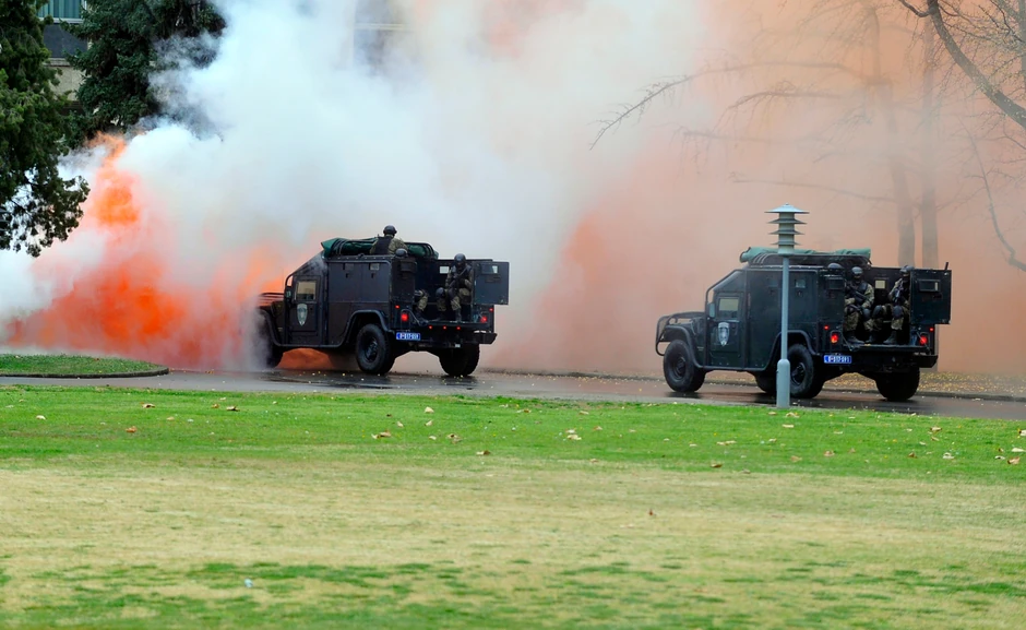Na scenu su stupila dva borbena oklopna vozila (BOV), jedno vozilo je išlo sa donje strane vagona po šinama, a drugo, koje je pratio i kamion sa specijalnim jedinicama, stiglo je s prednje strane vagona.