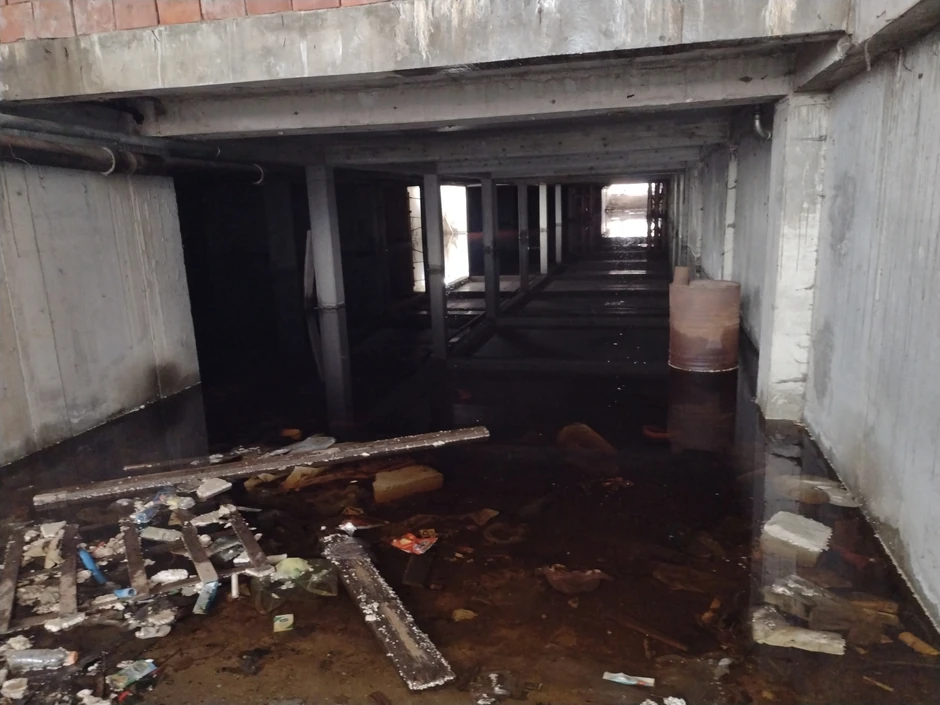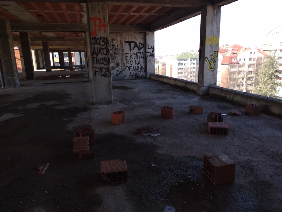 Na poslednjem spratu zgrade bez prozora, stalno šibane vetrovima, cigle poređane u krug kao za “sedeljku”. Grafiti su svuda po prostorijama. “Ta ekipa luta, ko na oblacima lasta”, “Grešili smo i opet ćemo”, “Gomila nelogičnih poteza”, samo su neke od poruka koje se mogu pročitati na nezavršenim zidovina zgrade. Kroz ispucale betonske blokove na pojedinim mestima kaplje voda, stvarajući još jeziviji ambijent.