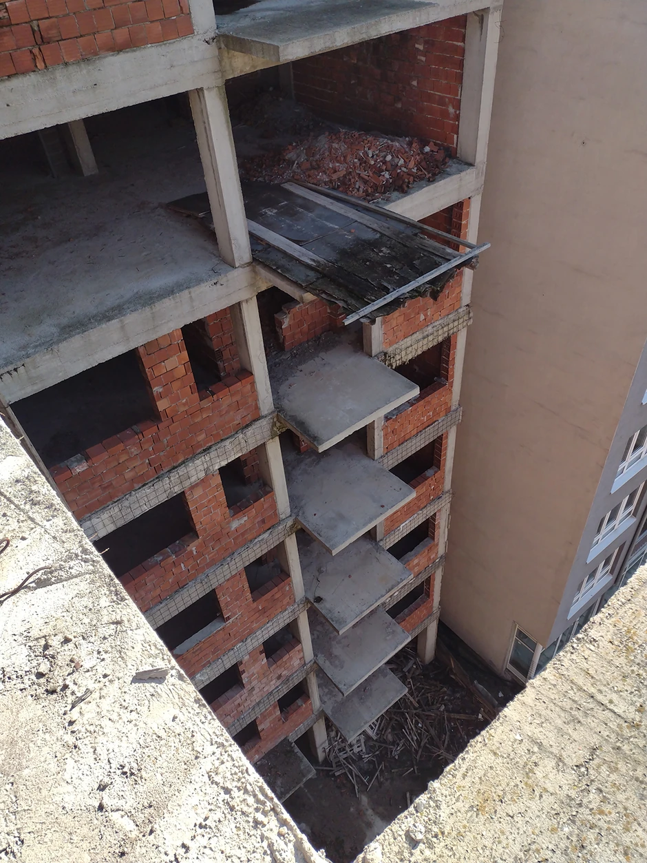 Betonska stepeništa bez ograde, kao i terase i zidovi potkrovlja, žice od armature vire svuda, svaki korak mora da bude oprezan jer ambis preti i po danu.