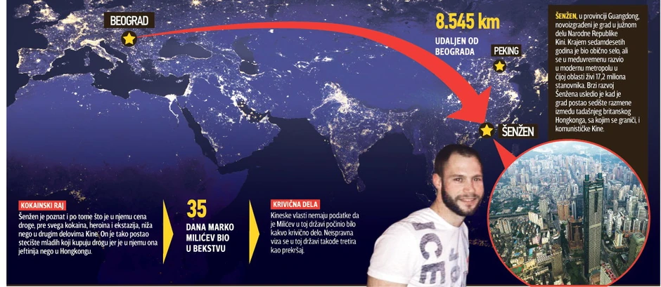 Kako „Blic“ saznaje, Marka Milićeva, koji je na poternici Interpola jer je automobilom usmrtio Luku Jovanovića, policija je zaustavila 29. avgusta uveče na ulici u blizini poznatog noćnog kluba “Peper”, u centralnom gradskom distriktu Futianui. Sa njim je bio Srbin poznat po organizovanju noćnih zabava u Šenženu. Njih dvojica su krenula na žurku u taj klub.