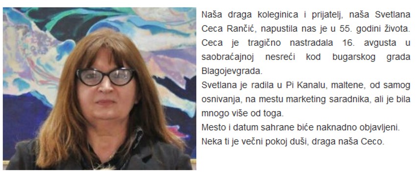 - Naša draga koleginica i prijatelj, naša Svetlana Ceca Rančić, napustila nas je u 55. godini života. Ceca je tragično nastradala 16. avgusta u saobraćajnoj nesreći kod bugarskog grada Blagojevgrada.