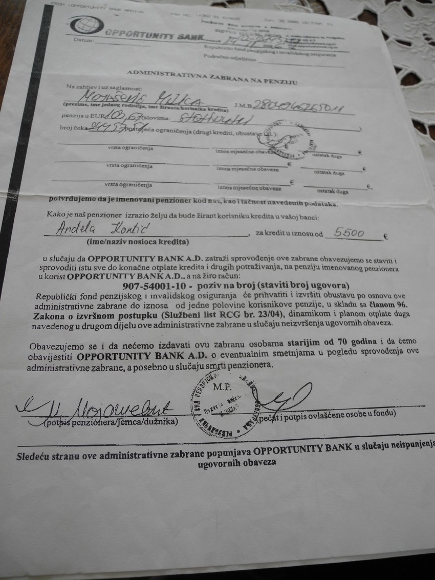 - Hoću punu istinu i odgovornost za sve. Da povlače ime moje mrtve majke i da moram dokazivati ovoj državi da je ona zaista mrtva, tu uvredu ne mogu zaboraviti i ganjaću do Strazbura da se kazne svi koji su u tome učestvovali. A nije kriv samo taj Redžović, koji je organizator. Nije on to mogao sam. Evo, ako je meni mogao uzeti podatke, jer se nijesam razdvajala sa njegovom porodicom, bili smo kao jedna kuća, ali podatke za moju mrtvu majku mu je mogao dati samo neko iz Fonda PIO. A i na ovoj administrativnoj zabrani stoji potpis Vere Milićević, službenice Fonda - objašnjava Milica pokazujući dokument iz Oportjuniti banke.