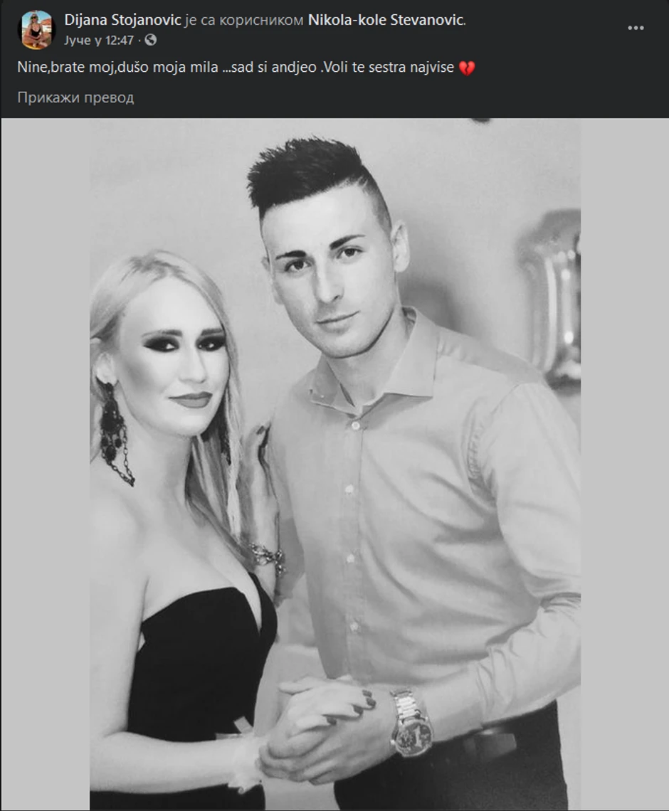 "Nine, brate moj, dušo moja mila... Sad si anđeo. Voli te sestra najviše." Ovom potresnom rečenicom Dijana Stojanović juče se na Fejsbuku oprostila od svog brata, mladog fudbalera Nikole Stevanovića Koleta (26) iz sela Donje Krajince kod Leskovca, koji je nastradao nakon skoka u Ohridsklo jezero. Nikola je 12 dana proveo u komi, a juče je preminuo.