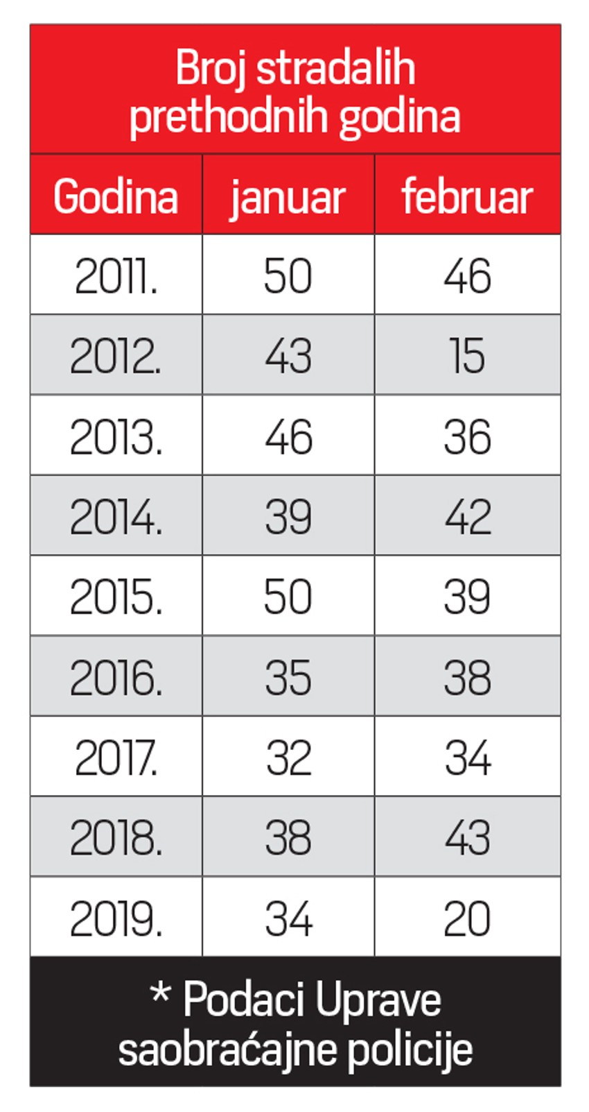I u Agenciji za bezbednost saobraćaja beleže crne brojke u februaru i to za prethodnih pet godina. U tom periodu poginulo je 177 osoba, odnosno u proseku 35 ljudi svake godine.