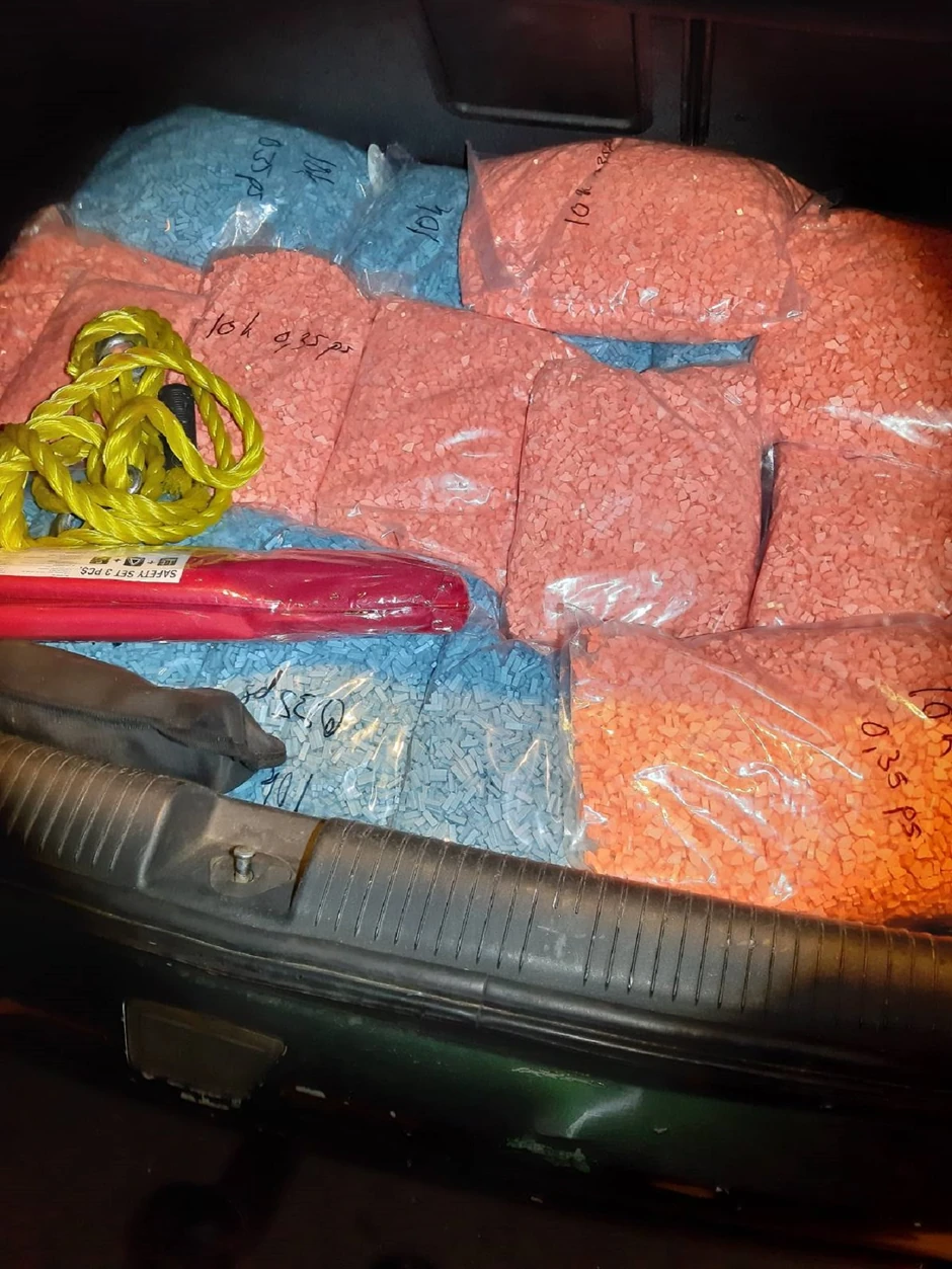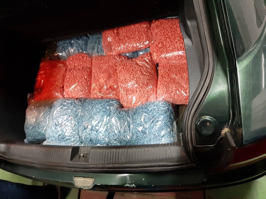 Daljom kontrolom je i u prtljažniku automobila, ispod tapacirunga prostora predviđenog za rezervni točak, pronađeno još 16 kesa identičnih narandžastih i plavih tableta.