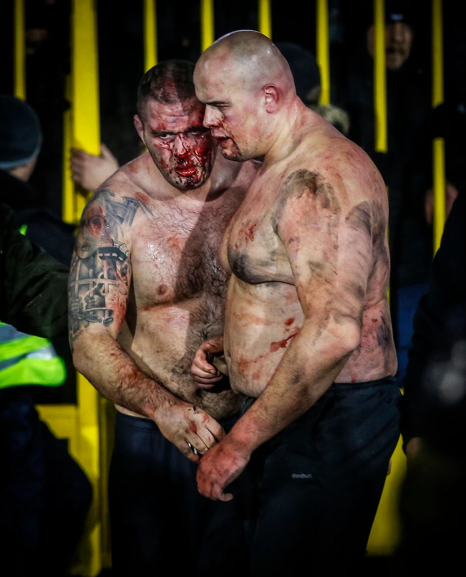 Višestruko brojniji, "grobari" su ih pržili bakljama, gazili im po glavi, udarali ih tako da su im lica bila totalno naduvena. Deo je uspeo da se vrati do zapada i tako izbegne batine, ali oni koji nisu, odnosno oni koji su kasnije viđeni na atletskoj stazi, izvukli su najdeblji kraj. Štaviše, odlučili su i da ih ponize za sva vremena. Skinuli su im dukseve u kojima su došli na tribinu, a zatim i pantalone sve do gaća i ostavili ih da stoje i čame u dnu tribine dok su im stvari bacili na lomaču i zapalili. Dim je kuljao oko njih, dok su se oni u dnu borili za goli život. Na kraju su izbačeni sa tribine na atletsku stazu tako goli, da ih isproziva čitav stadion.