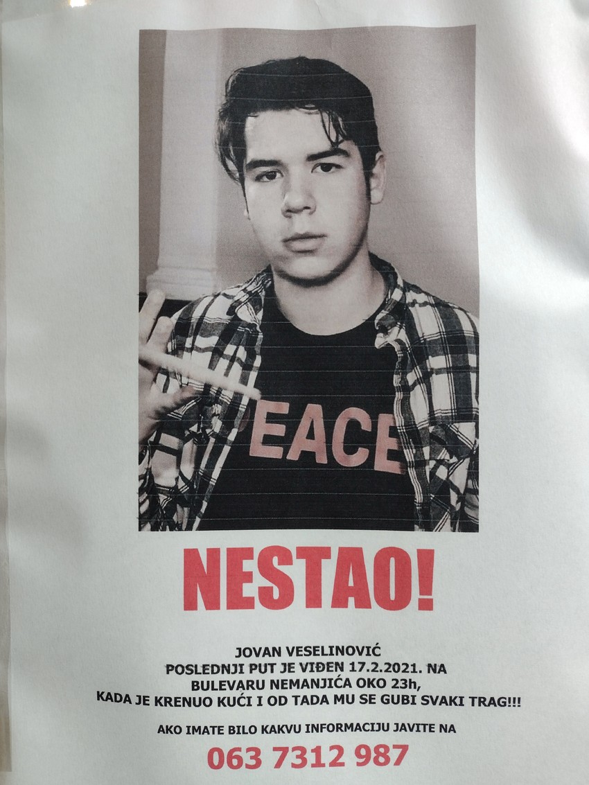 - Poštovanje, Milica kraj telefona, mama nestalog dečaka Jovana Veselinovića. Tražim gospodina koji me je danas kontaktirao mislivši da ga je video u Mirijevu. S obzirom da imam registrovanih preko 200 telefonskih poziva danas, moram ići redom i svakom se obratiti za svaki slučaj. U koliko ste to Vi, kontaktirajte me čim možete. Ukoliko je greška, molim Vas me zamerite, napisala je Milica. Ukoliko osoba koja je kontaktirala sa njom o tome, vidi ovu objavu mogla bi da joj se javi.