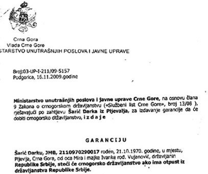 Ministarstvo unutrašnjih poslova Crne Gore dalo je garanciju Darku Šariću, osumnjičenom za šverc 2,7 tona kokaina, da će mu vratiti u državljanstvo Crne Gore ukoliko dobije otpust iz državljanstva Srbije, za šta je on preko posrednika podneo zahtev 11. januara ove godine, samo devet dana pre nego što su za njim srpski istražni organi raspisali poternicu. Međutim, kako je za njim raspisana međunarodna poternica, mali su izgledi da će dobiti otpust i time mogućnost da ponovo postane Crnogorac.