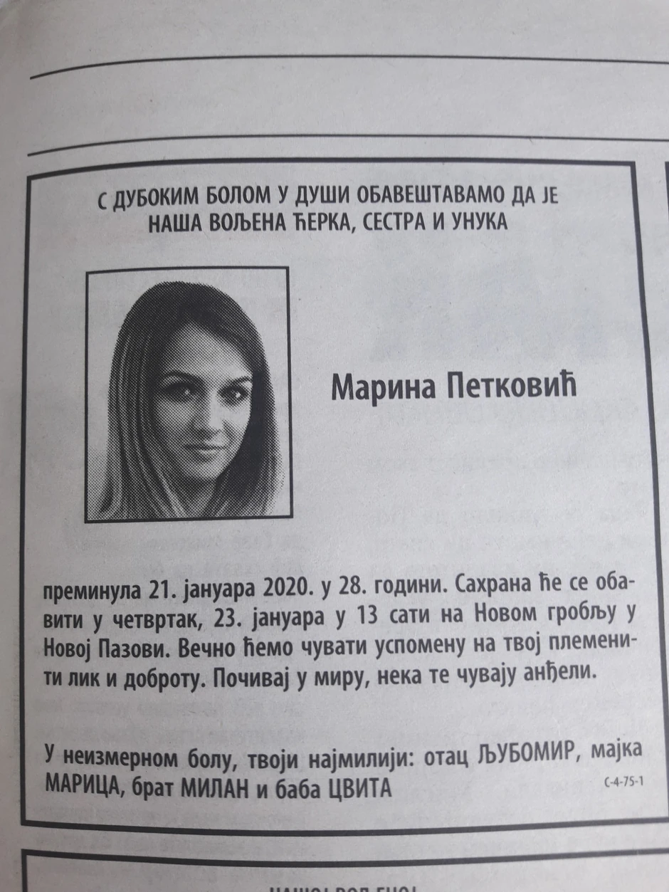 - Večno ćemo čuvati uspomenu na tvoj plemeniti lik i dobrotu. Počivaj u miru, neka te anđeli čuvaju - naveli su članovi njene porodice u poslednjem pozdravu.