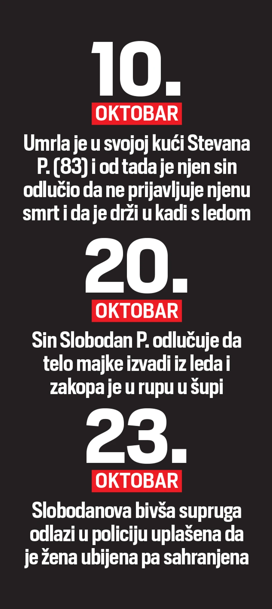 - Kako bi nastavio da prima njenu penziju, najpre je beživotno telo držao na krevetu u sobi, zatim ga je prebacio u kadu ispunjenu ledom, a kada je počeo da se širi smrad truleži, odlučio je da je zakopa. U garaži je iskopao rupu metar sa metar, i čak je stavio betonsku košuljicu da bi prikrio nepodnošljiv smrad. Za sve to vreme bivšoj ženi, koja ga je i prijavila policiji, govorio je da je majka u bolnici. Njoj je međutim bilo čudno kada ga je videla da kopa rupu, pa ga je prijavila i iznela je sumnju da je Slobodan možda nešto uradio nesrećnoj ženi - dodaje naš izvor.