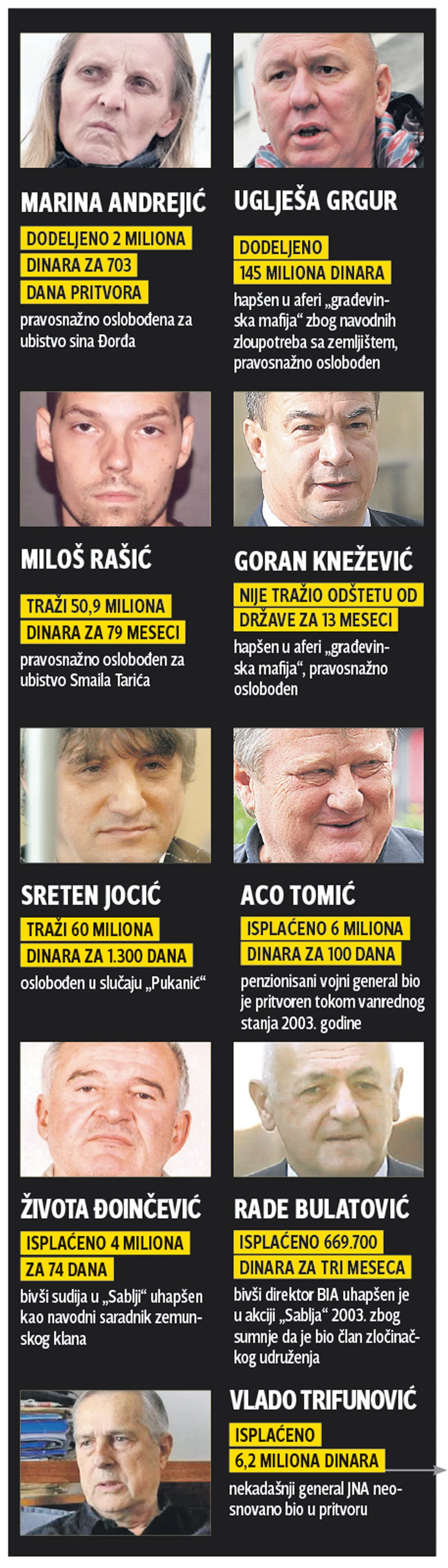 Poslednja u nizu onih koji su tužili državu, ali su kivni zbog male odštete i najavljuju tužbu u Strazburu je Marina Andrejić, koja je bila uhapšena zbog sumnje da je ubila sina Đorđa. Za 703 dana određena joj je odšteta od dva miliona dinara ili oko 2.800 dinara po danu.