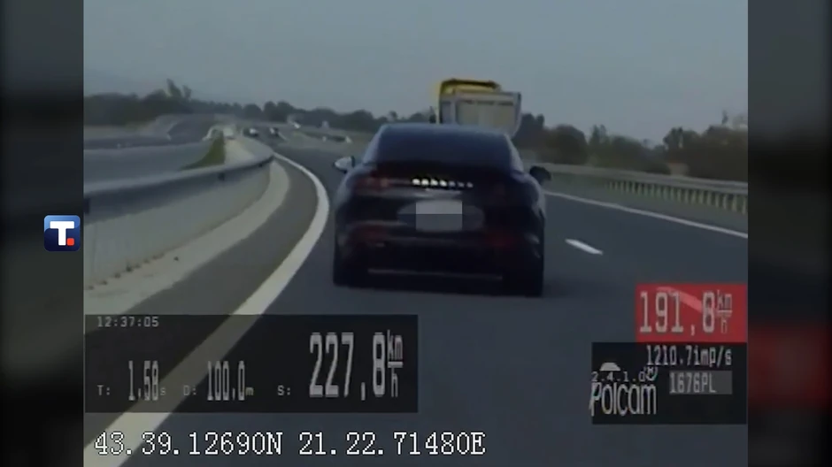 Policijski službenici Uprave saobraćajne policije presretačem su zaustavili vozača (34) vozila "porše panamera", koji se na auto-putu Kruševac - Pojate, u Varvarinu, kretao brzinom od 227,8 kilometara na čas, na delu puta gde je ograničenje brzine 130 kilometara na čas.