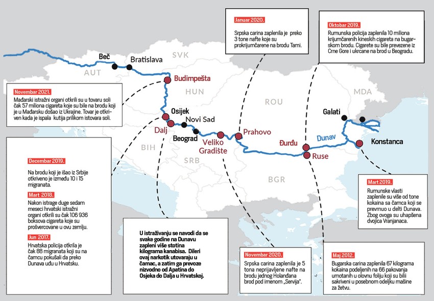 - U septembru 2006. austrijska policija otkrila je više od tone kanabisa u vrednosti od 10 miliona evra u kontejneru koji je stigao iz Hamburga. S druge strane, u martu 2019, rumunske vlasti su uhapsile dvojicu vozača kamiona iz Vranja, Srbija (za koje se veruje da su deo škaljarskog klana), nakon što se u delti Dunava prevrnuo brod sa više od tone kokaina sa 90 odsto čistoće. Pretpostavlja se da je bio još jedan brod sa sličnom količinom kokaina i da je stigao do obale, odakle se droga transportovala dalje kamionom. U junu 2020. godine u blizini Osijeka zaplenjeno 100 kilograma marihuane u Hrvatskoj koja je bila u Dunavu - navodi se u istraživanju.