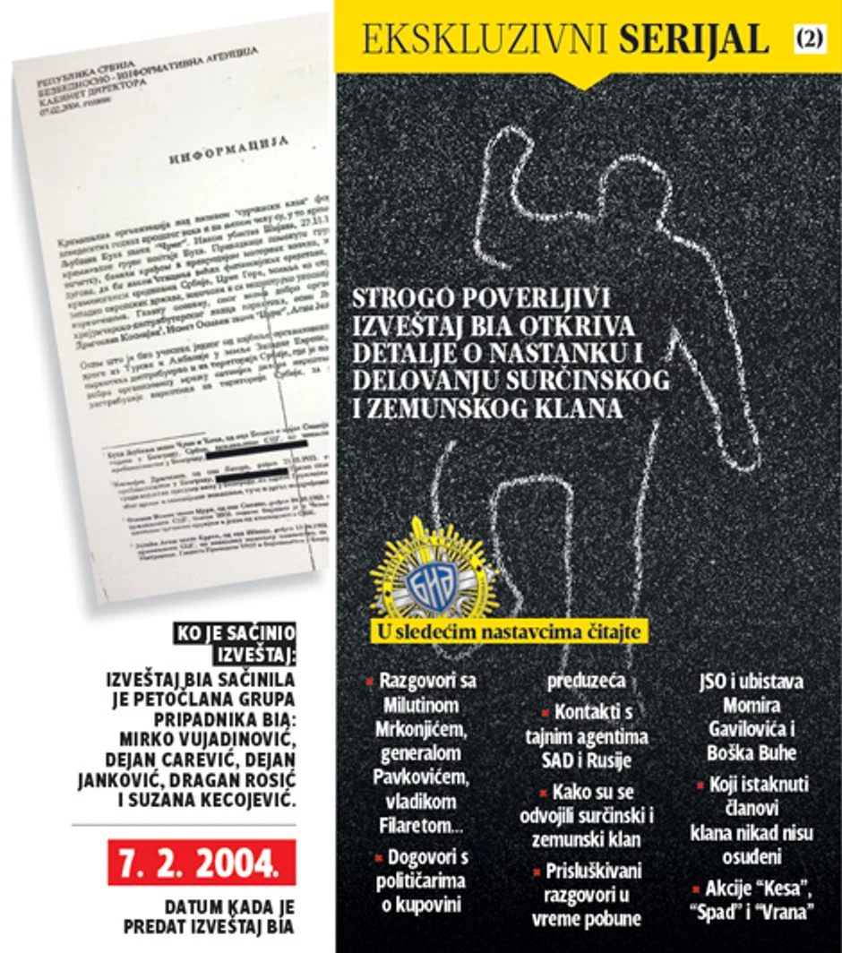 Danas prenosimo saznanja do kojih su operativci BIA došli o kontaktu članova klana, a pre svih Ljubiše Buhe Čumeta, sa Vladimirom - Bebom Popovićem. Te informacije, do kojih su došli prisluškivanjem razgovora i terenskim radom, operativci BIA pretočili su u izveštaj koji je direktoru agencije dostavljen 7. februara 2004. godine, a sada je prvi put ugledao svetlost dana.
