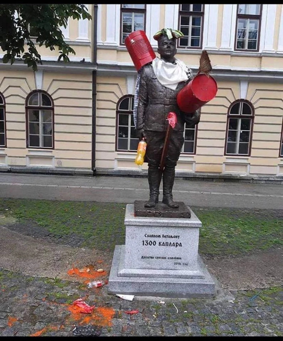 Spomenik đaku–oficiru, koji o desnom ramenu nosi pušku, a pod levom rukom knjigu, je osvanuo naružen kantama za smeće, korama od lubenice, kesama, metlom, daskom.