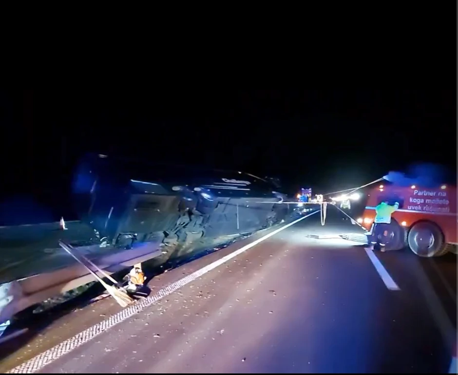 Autobus je sleteo sa kolovoza sinoć oko 23b časa i prevrnuo se na levi bok pa je uz pomoć teške mehanizacije za šlepanje kamiona i autobusa, ponovo podignut na točkove. Kako se vidi na snimku, deo bankine je iskidan a stakla na desnoj strani su ostala cela. Povređeni putnici su se verovatno nalazili na levoj strani autobusa.