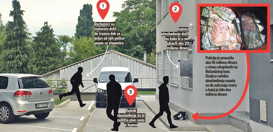 Naime, G. S. i G. M., radnici firme "Inex servis group", koja se bavi fizičkim obezbeđenjem i transportom novca i vrednosti, došli su ispred trezora u Tošinom bunaru u nameri da u njemu ostave novac. Borko Stojanović, rukovodilac službe interne kontrole u "Inexu", objašnjava za "Blic" da je reč o dnevno noćnom trezoru čiji se sef u zidu otvara šifrom i pošiljke se ubacuju pod kamerama.