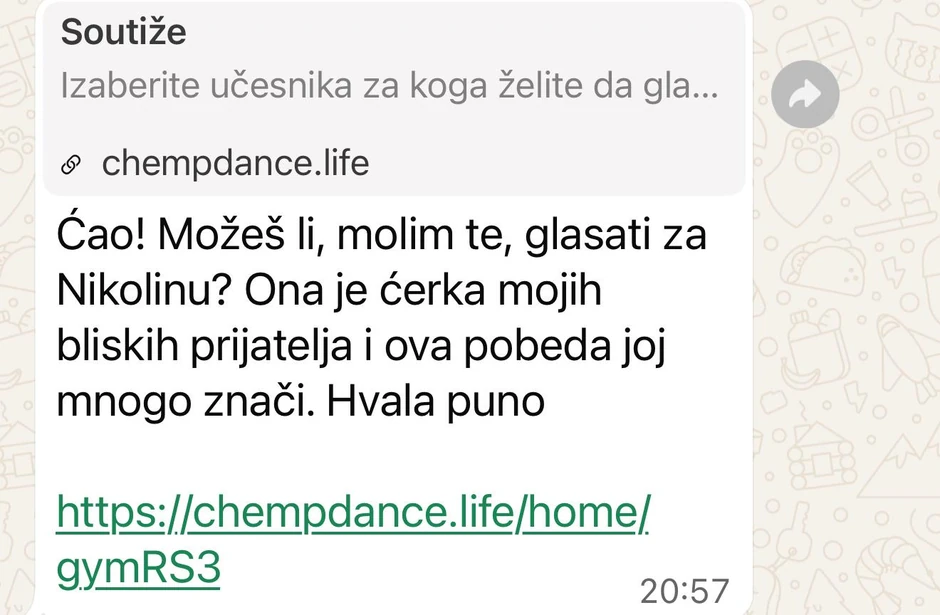 - Prevaranti šalju poruku sa linkom i molbom da se glasa za ćerku, sestru, poznanicu koje učestvuju na takmičenju (poruka se može dobiti i sa poznatog broja, što znači da je neko već hakovan)