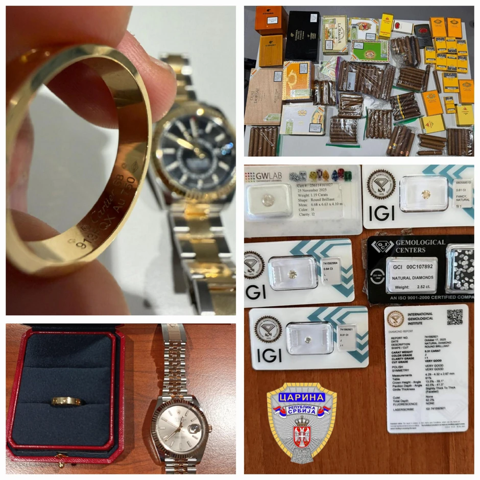 Dragocenosti vredne gotovo 5 miliona dinara otkrivene su kada su zaustavljena dvojica putnika koji su se zajedno vraćali iz Beča, a nisu ih prethodno prijavili već su se uputili u zeleni kontrolni prolaz. Tokom detaljne kontrole otkriveno je da na sebi nose po jedan novi luksuzni sat marke "Rolex" kao i po jedan prsten "Cartier", dok se pripadajuća dokumentacija nalazila u rancu jednog od njih.