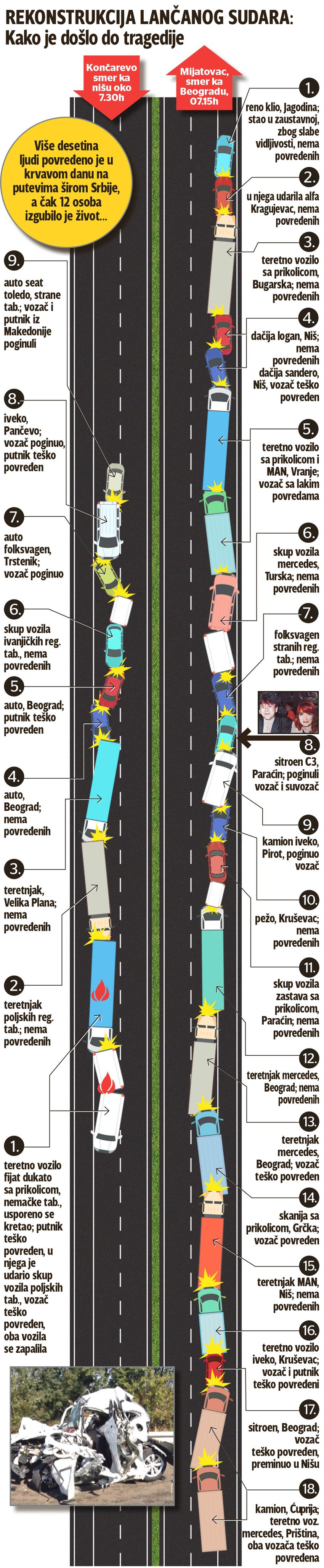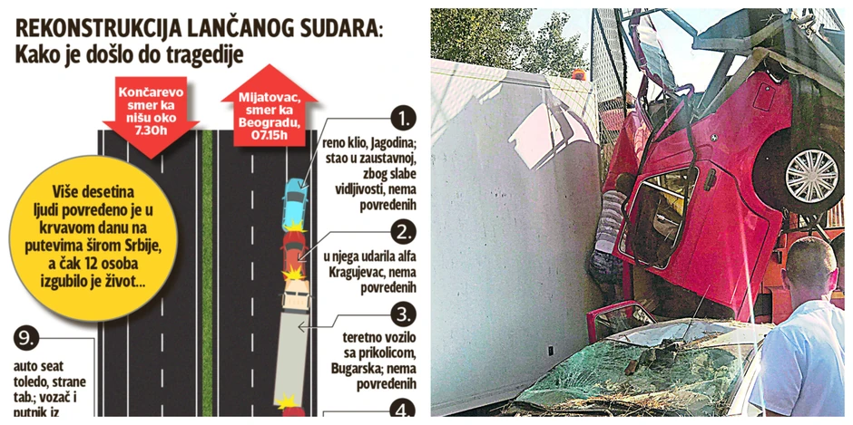 Dva stravična lančana sudara koja su se dogodila u utorak ujutru kod Jagodine odnela su osam života, u njima je povređeno nekoliko desetina ljudi, a učestvovalo je tridesetak vozila, od kojih su neka potpuno izgorela. “Blic” je uspeo da utvrdi kako je tačno došlo do jedne od najvećih tragedija na srpskim putevima u poslednjih nekoliko godina.