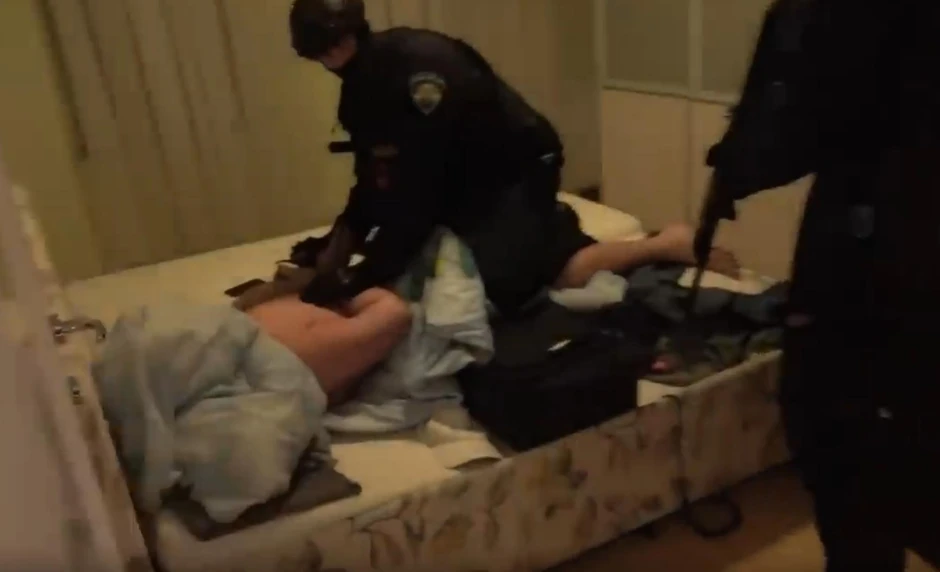 Na snimku se vidi kako policajci u munjevitoj akciji hapsi razgolićene muškarce koje su se zatekli u krevetima jedne privatne kuće. USKOK je otvorio istragu protiv desetorice pripadnika kriminalne grupe koja je na području Đakova uzgajala marihuanu.